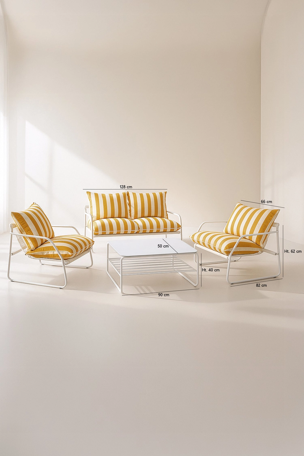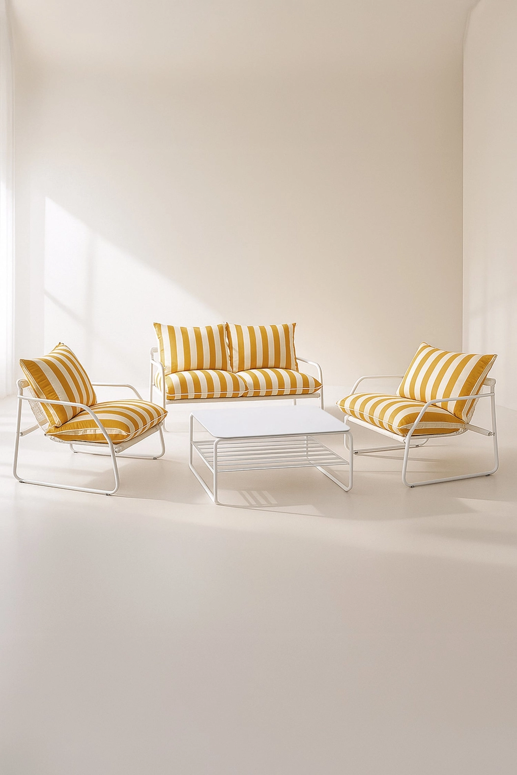 Ce salon de jardin allie élégance, confort et modernité pour sublimer vos espaces extérieurs. Composé d’un canapé deux places et de deux fauteuils assortis, il offre un espace convivial idéal pour partager des moments de détente en famille ou entre amis. Les assises en tissu aux rayures Bouton d’or et blanc apportent une touche de fraîcheur et de dynamisme, tout en évoquant l’esprit estival. Ce choix de coloris lumineux permet de créer une ambiance chaleureuse et accueillante, parfaite pour profiter pleinement des beaux jours. La structure assure robustesse et durabilité, tandis que les coussins généreusement rembourrés garantissent un excellent confort d’assise. Facile à entretenir, le tissu est conçu pour résister à un usage extérieur tout en conservant son éclat. L’ensemble est complété par une table basse en acier blanc, surmontée d’un plateau en verre trempé blanc. À la fois design et pratique, elle offre une surface idéale pour accueillir boissons, livres ou objets décoratifs, tout en apportant une touche contemporaine à l’ensemble. Avec son style harmonieux et ses finitions soignées, ce salon de jardin constitue un choix parfait pour aménager une terrasse, un balcon ou un jardin avec goût et modernité.